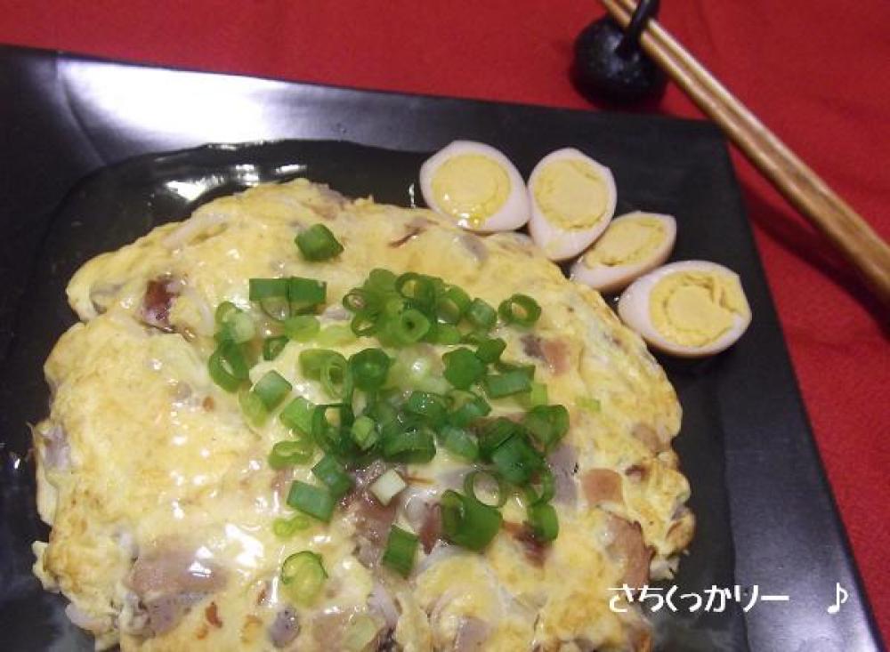 オムレツ→あん→万能ねぎとのせてうずらの卵を添えます。