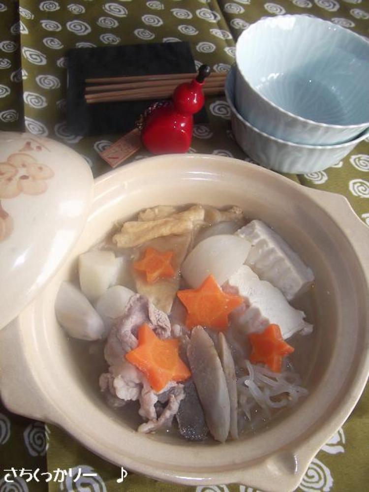 具材全部に火が通ったら、Eを入れて味をととのえお好みで七味唐辛子をかけて頂きます。