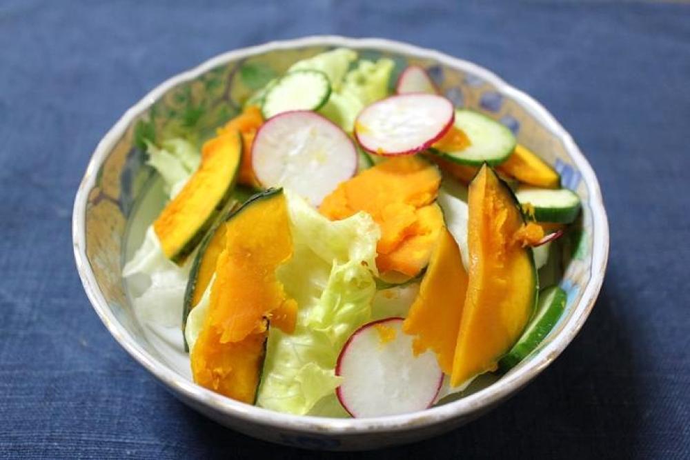 レタスは手でちぎり、きゅうりは小口切りに、ラディッシュは薄切りに、かぼちゃはスライスします。