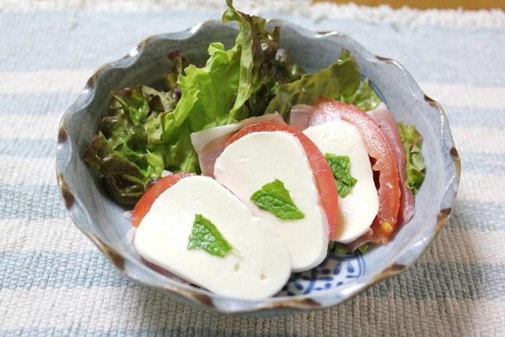 生ハムの上にトマトスライス・モッツァレラチーズをのせ、あれば千切ったハーブをのせたら出来上がり。