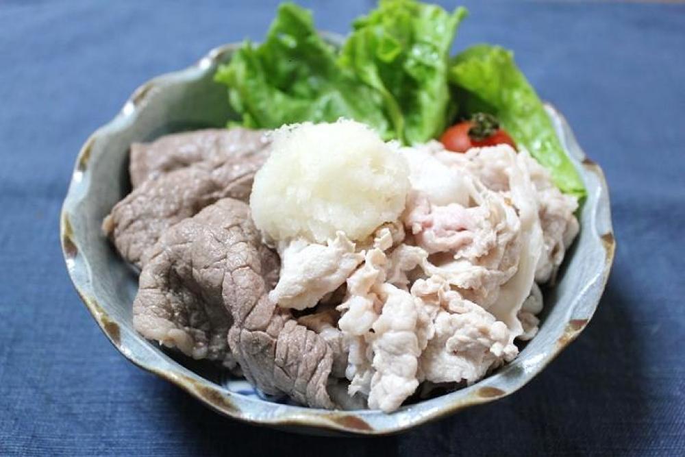 お皿に牛肉・豚肉を盛りつけ、大根おろしをのせてポン酢をかけたら出来上がり。