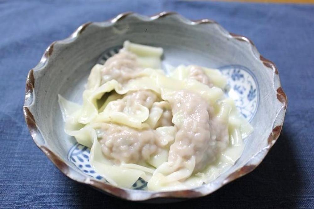 餡をワンタンの皮で包み、熱湯で5分茹でたらしっかりと