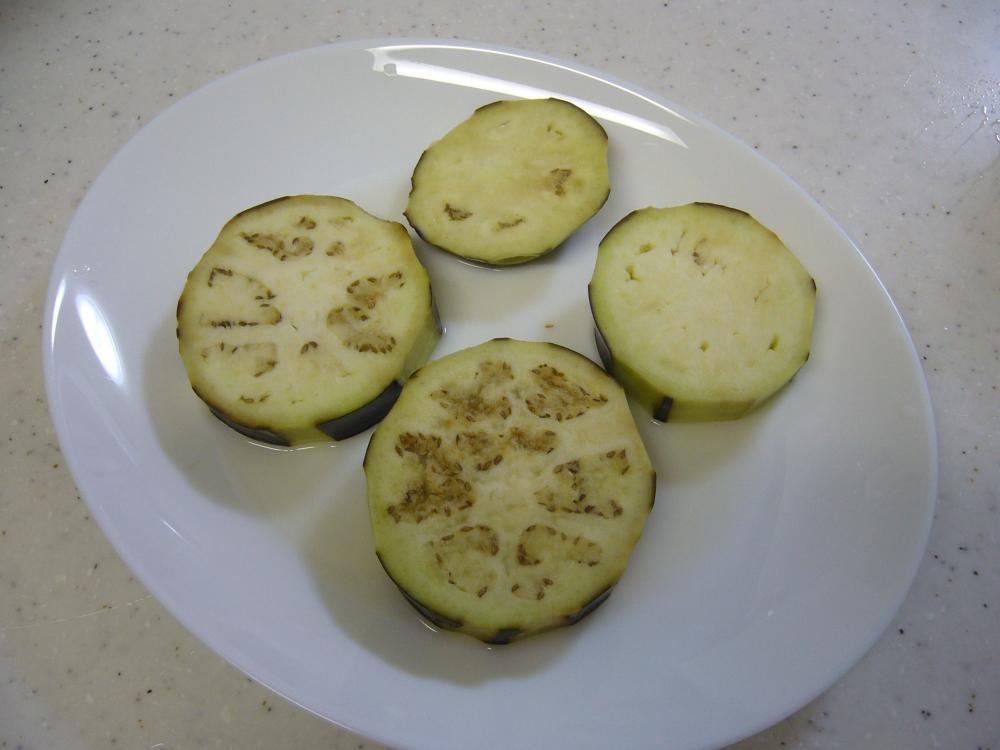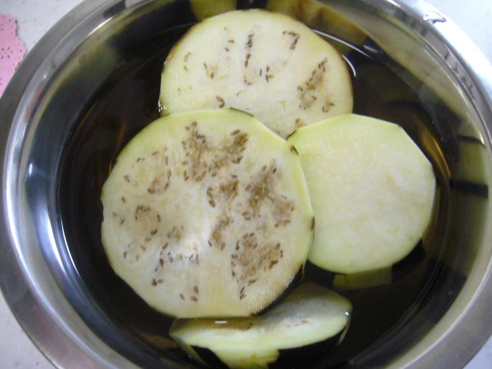 ![]() 米なすは2cm幅の輪切りにし、水につけてあく抜きする。