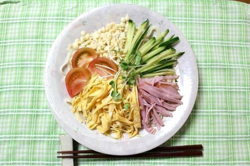 お皿にうどんを盛り付け、錦糸玉子・きゅうり・ハム・トマト・揚げたま・かいわれ大根をのせます。