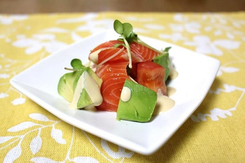サーモン・アボカド・トマト・かいわれをお皿に盛り付け、②のドレッシングをかけたら出来上がり。