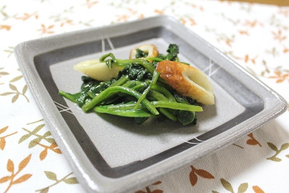 ほうれん草はざく切りに、ちくわは斜め切りにします。