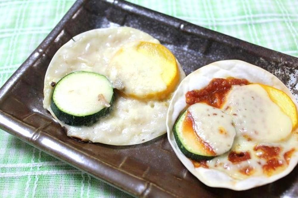 8枚の餃子の皮にピザソースを塗り、ズッキーニ(黄・緑)・とろけるスライスチーズを1枚ずつのせます。