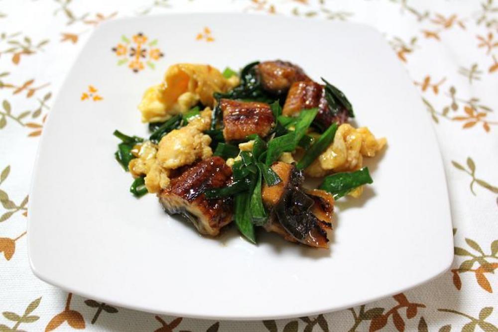 ニラとうなぎを加えて炒め、うなぎのたれ・オイスターソース・酒を加えて軽く炒めます。