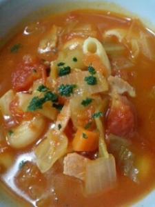沸騰したら、コンソメ、さらにトマトを加え、茹でたマカロニを入れて、塩コショウで味を整えます。再び沸騰したら、出来上がり!