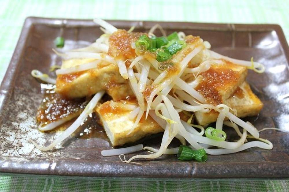 お皿に厚揚げ・もやしを盛りつけ、刻んだ万能ねぎをのせ、大根おろしだれをかけたら出来上がり。