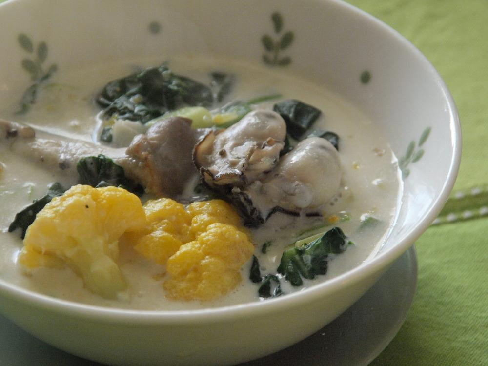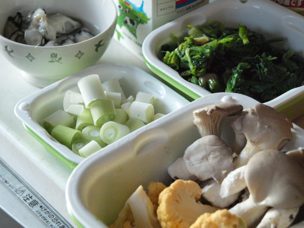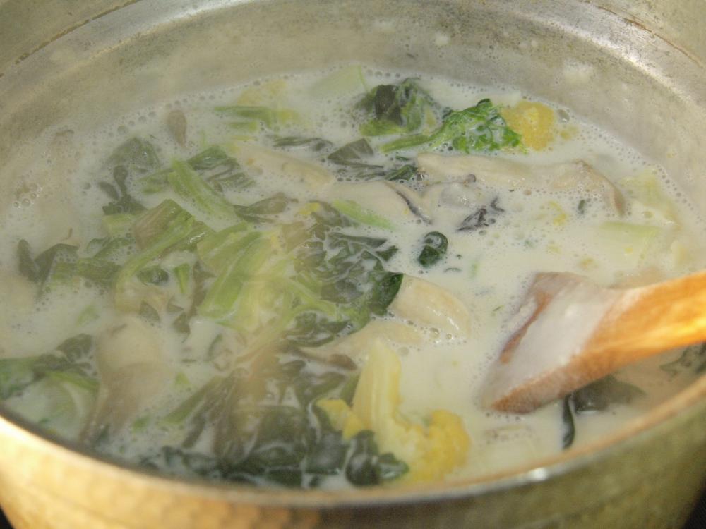 ![]() 最後に,牡蠣とほうれん草を入れて、温まったら出来上がりです。好みで塩、コショウを軽く足して下さい