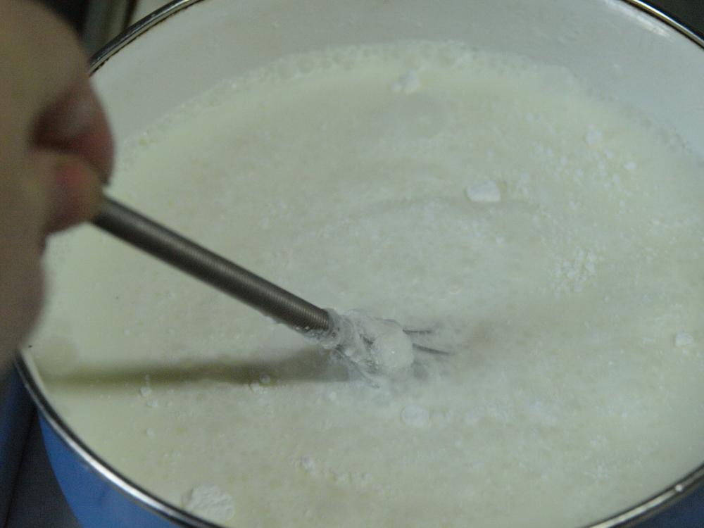 ![]() 低脂肪ミルクと米粉をボールに入れ、泡だて器で混ぜ合わせる