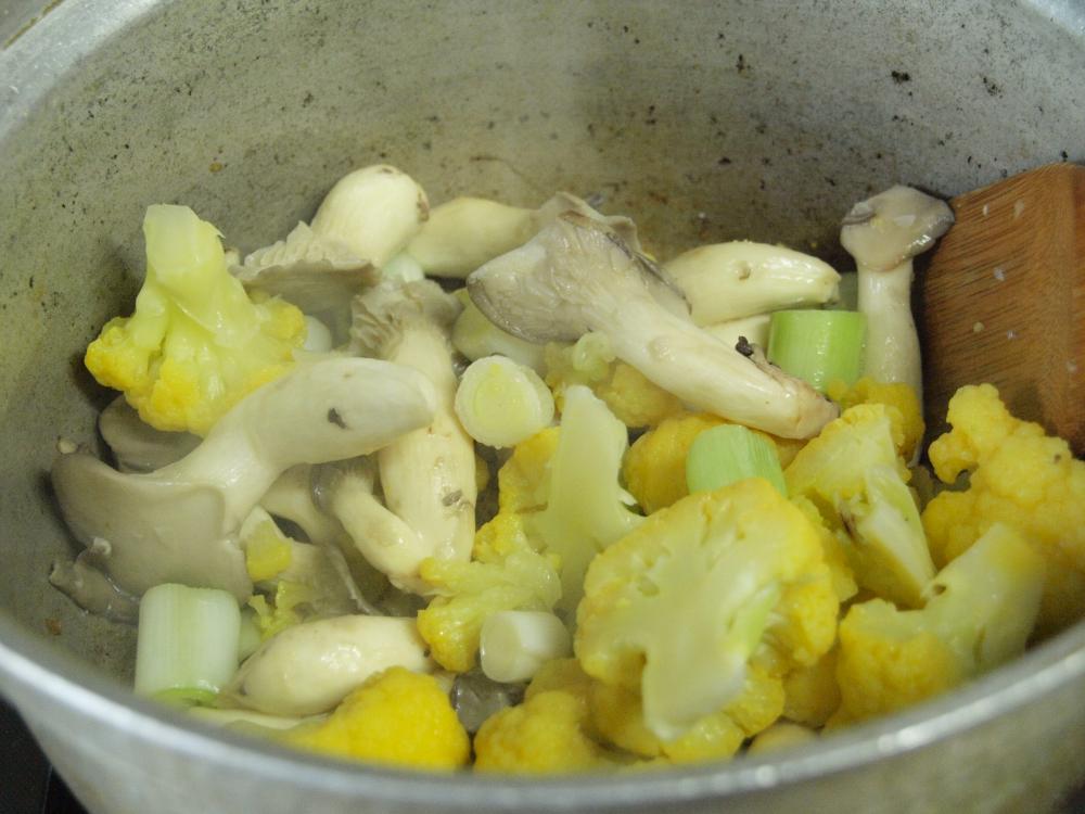 ![]() サラダオイル小さじ2で葱をしんなり炒め、平茸、茹でカリフラワーを塩コショウ少々で炒める