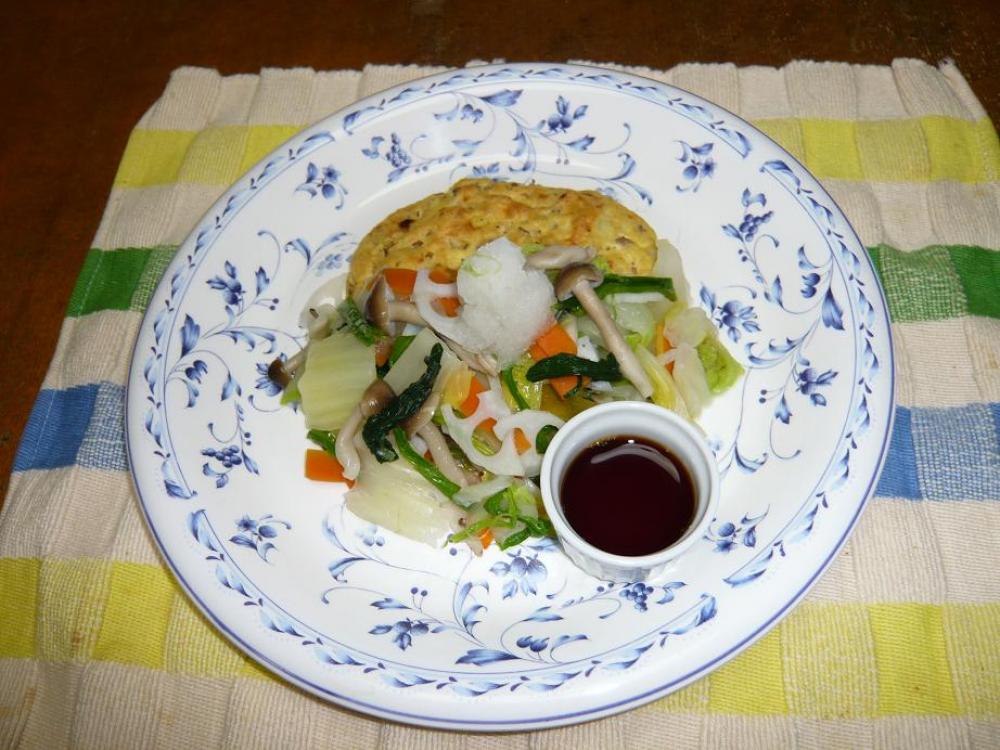 ![]() やさいは火の通りにくい物からボイル小松菜を混ぜ、おろしを作る。