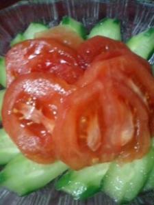 キュウリは皮を縞目にむき、塩少々をふって軽くもみ、洗い流します。トマトは3~4㎜の輪切りにします。