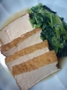 鍋にだし汁と調味料を入れ、厚揚げを7~8分煮ます。次に小松菜を加えて2~3分。煮汁ごと器に盛ります。
