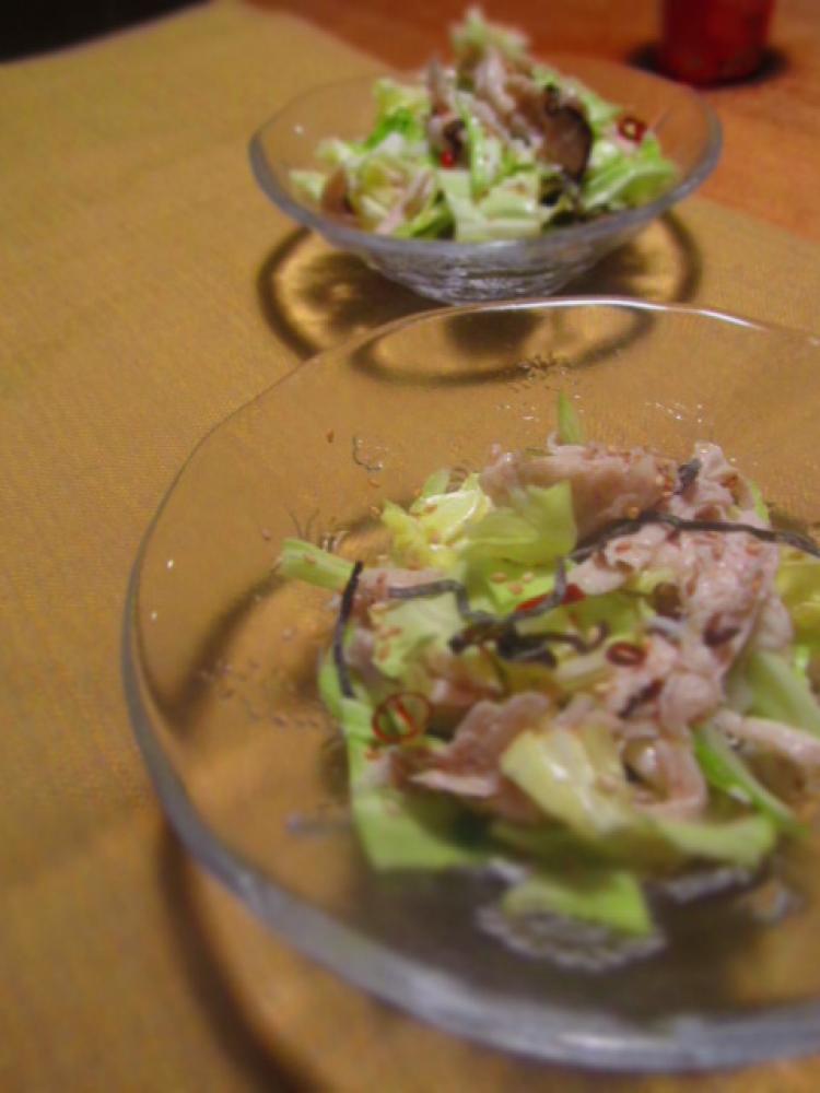 ささ身は茹でて、細かく割く。キャベツは一口大に手でちぎる。