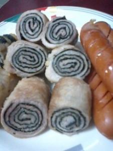 巻き終わりを下にして置いておきます。食べる前に、小麦粉をまぶして焼きます。