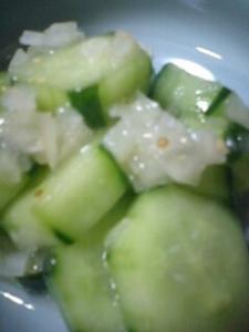 玉ねぎをみじん切りにして、ドレッシング用の調味料と合わせます。これにキュウリを混ぜ入れて、冷蔵庫で15分位ねかせます。