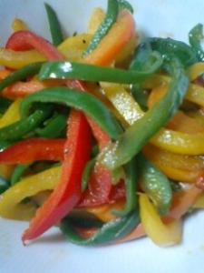 野菜はすべて細切りにします。パプリカを先に入れて、炒めていきます。
