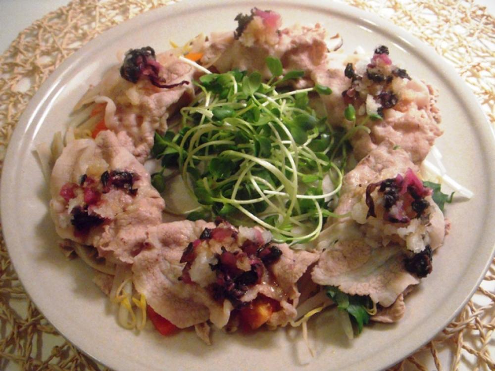 皿にカイワレ大根を盛り3をのせ、上にしば漬けおろしをのせ、ポン酢をかける。
