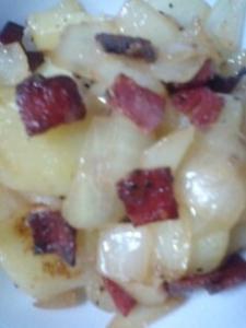 フライパンにオリーブ油を中火で熱し、ベーコンを炒め、玉ねぎがしんなりしてきたら、じゃがいもを加えて炒めます。