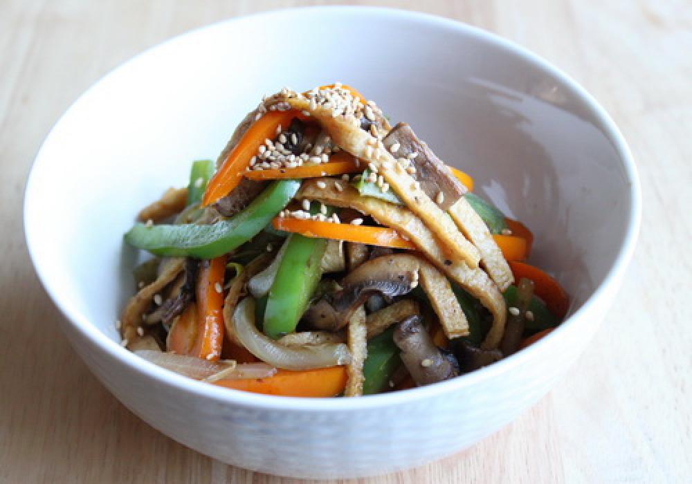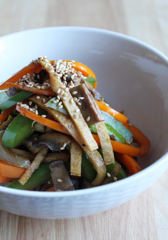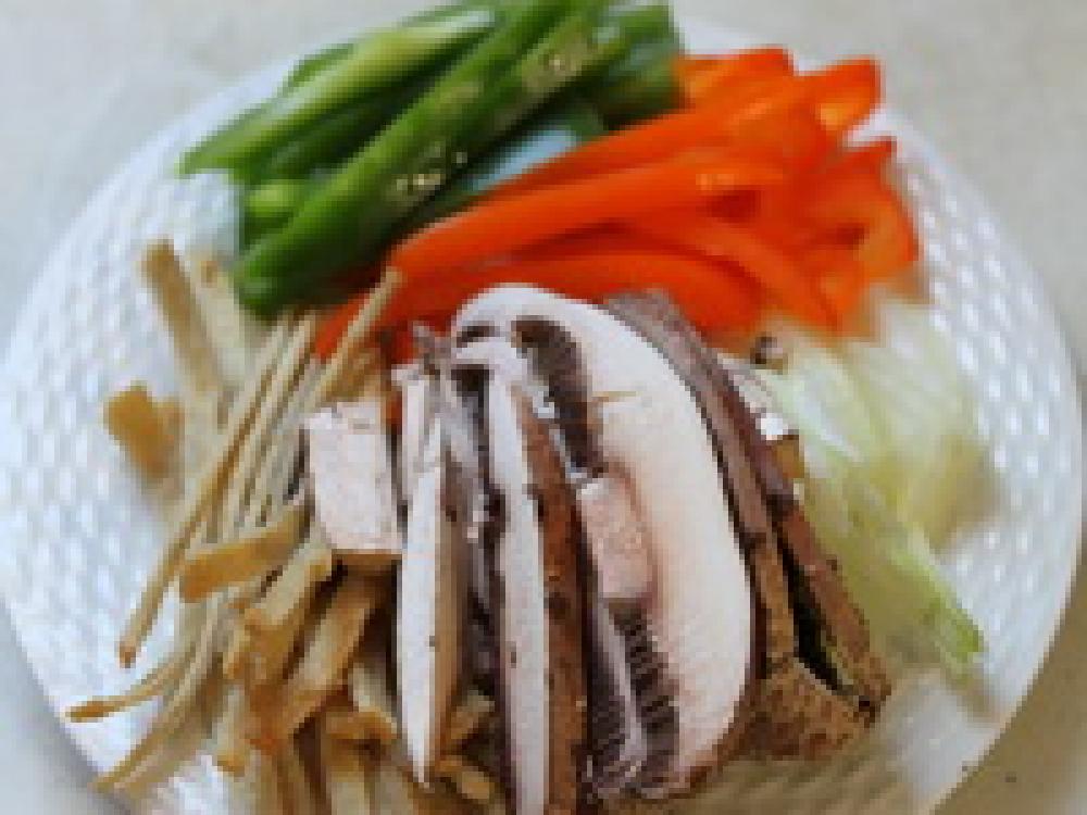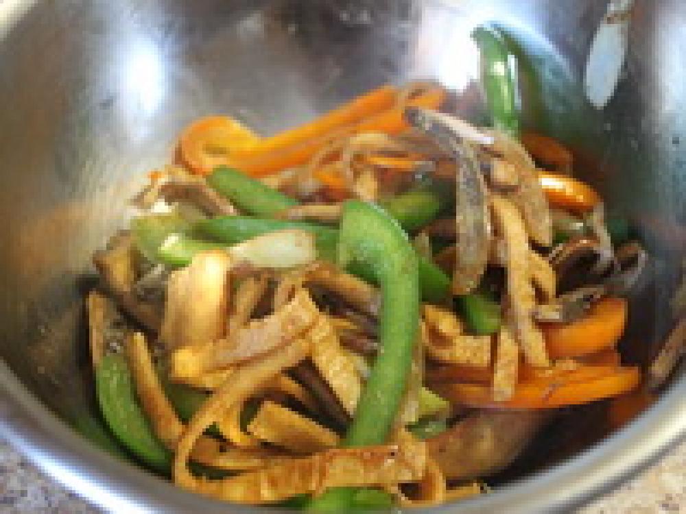 ![]() ごま油を熱し、パプリカ、ピーマン、しいたけ、玉葱を炒め、塩、ペッパー、砂糖で味付けし、2.のボールに入れます。