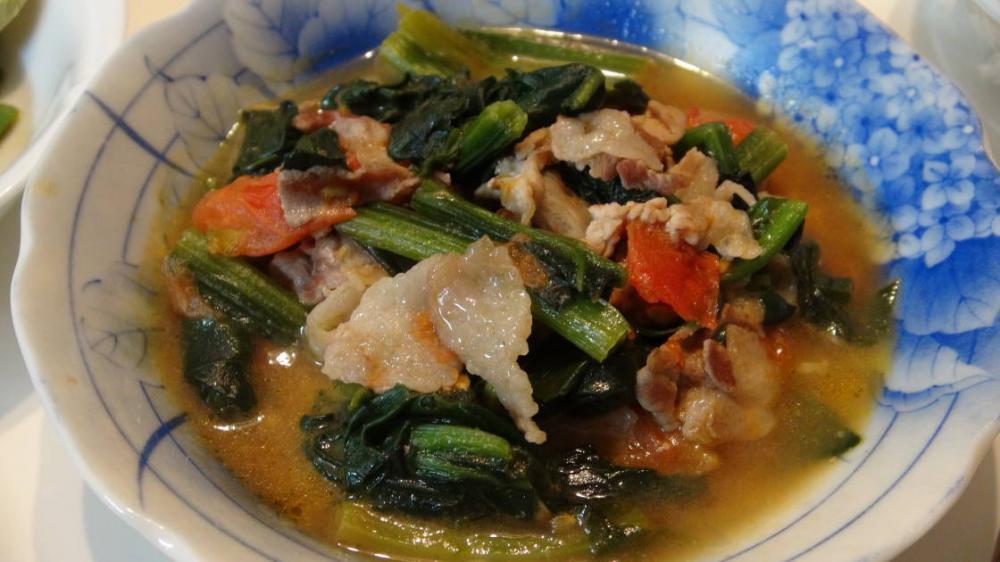 2.を軽く炒めたら、合わせ調味料を入れる。強火にしフツフツしたのを確認し、ほうれん草・トマトを入れる。火が通れば完成♪