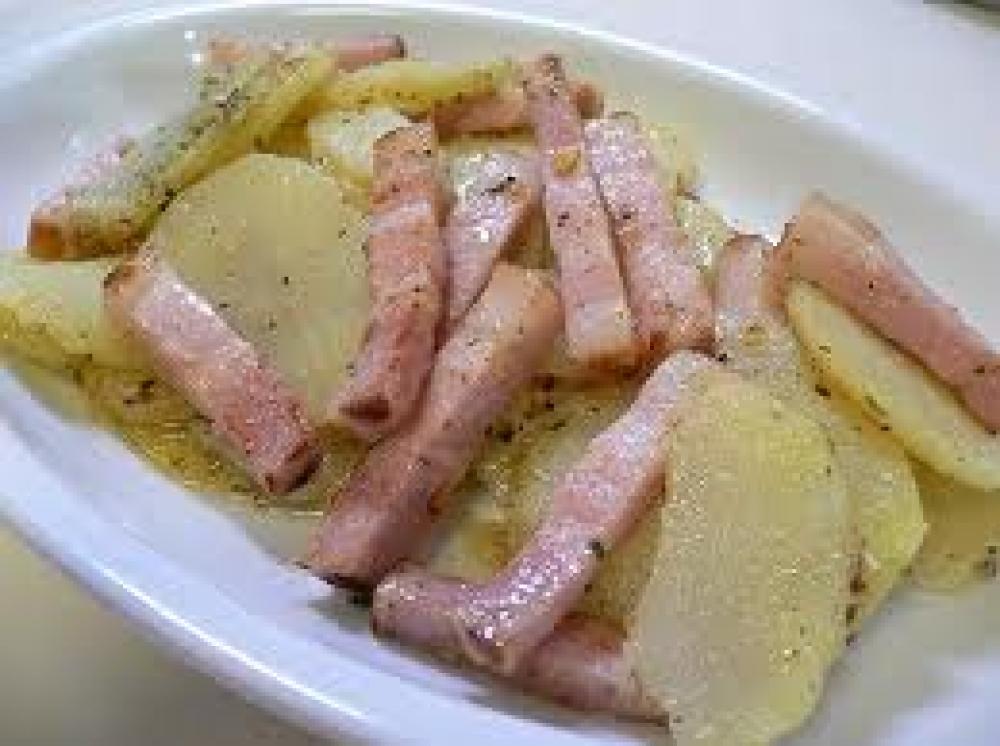 ![]() ベーコンを短冊切りに、じゃがいもを薄く切り、バターを火にかけ、ベーコン、じゃがいもの順に炒め、塩こしょうを振る