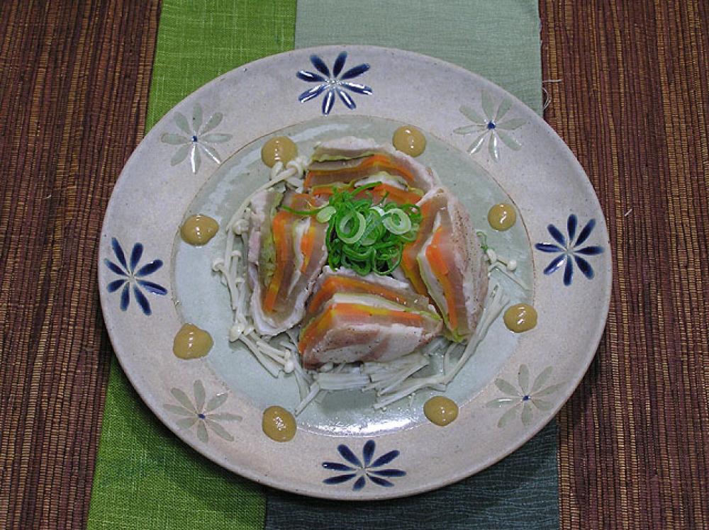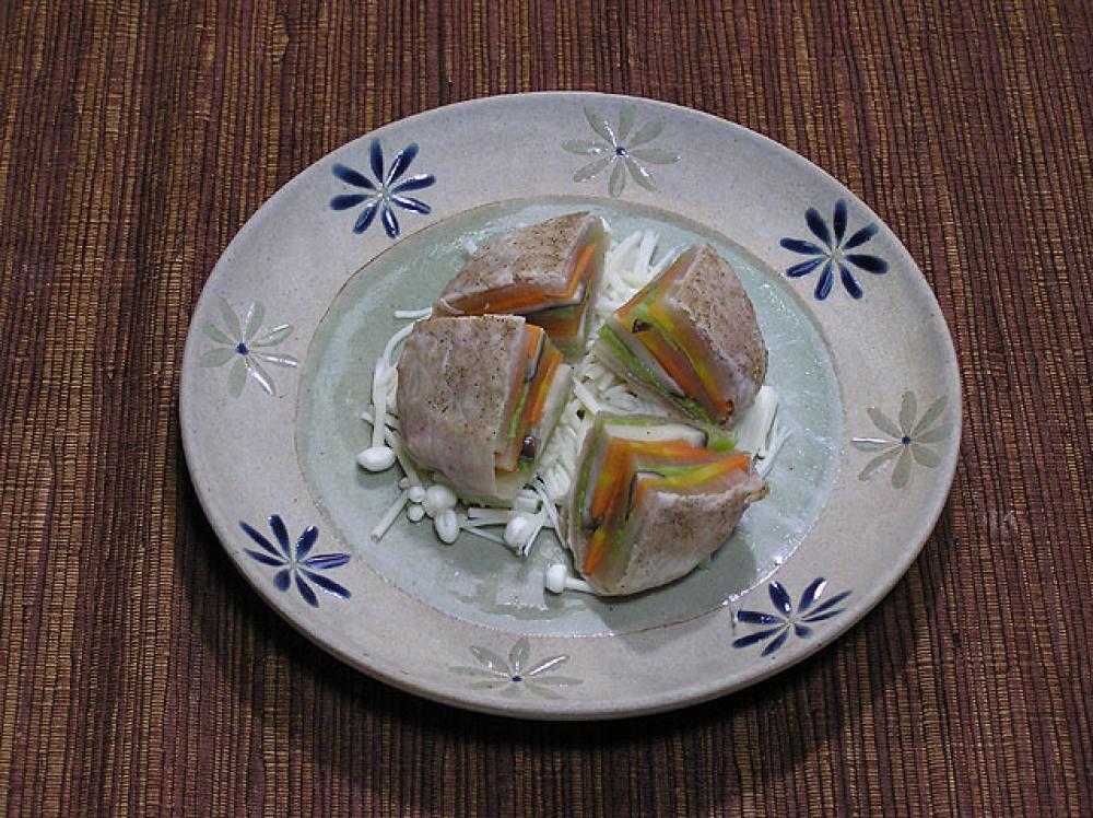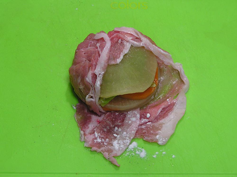 ![]() 豚ロース肉を並べて塩胡椒、薄力粉をふりかけ、1の野菜を包みます。グリルで約7分網焼きにします.