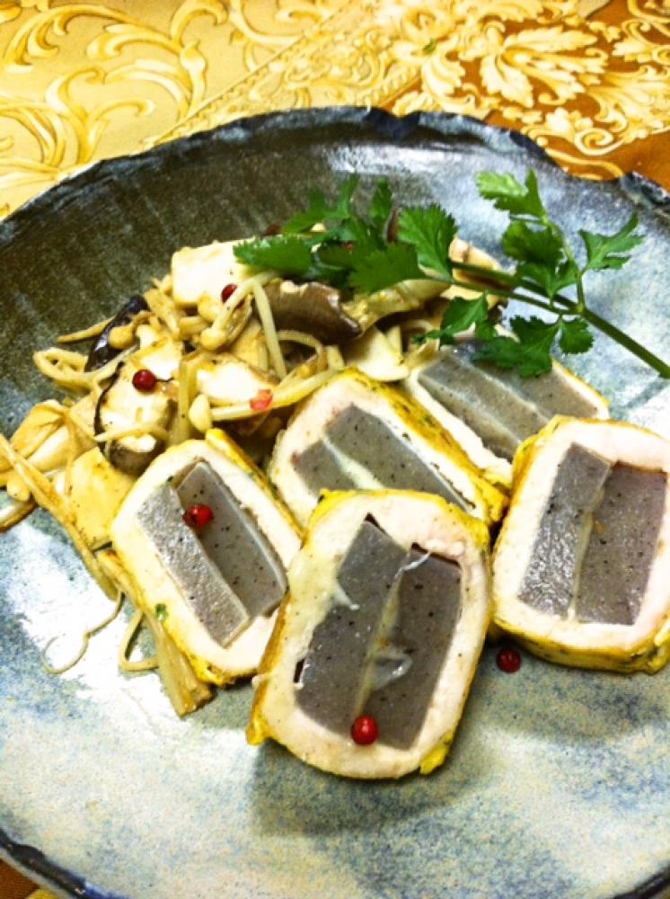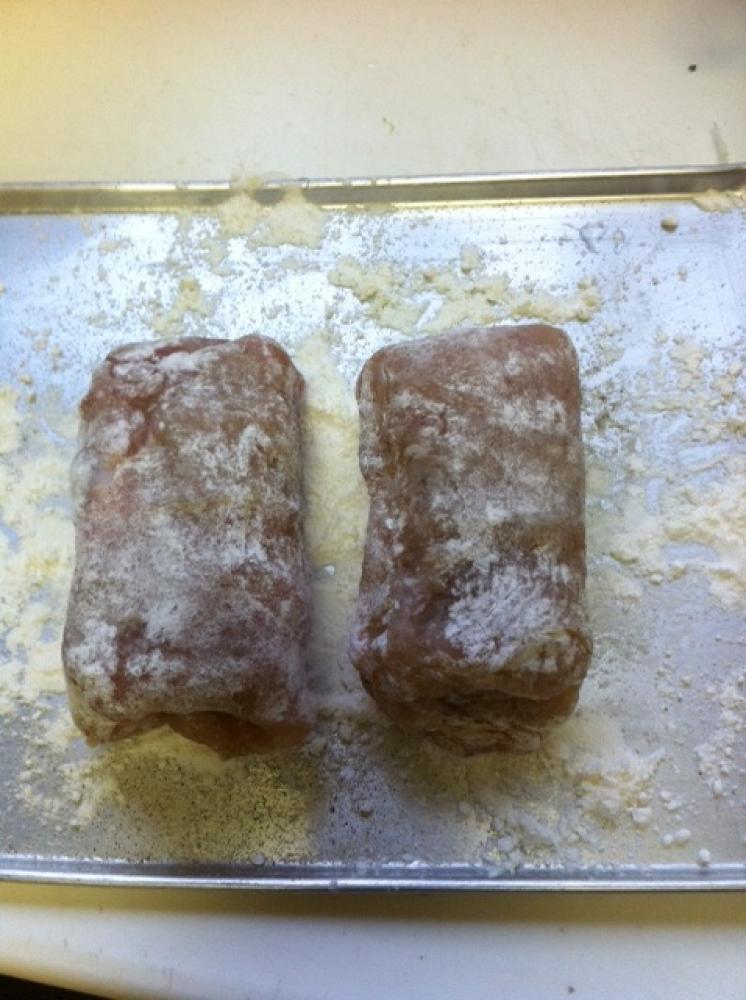 ![]() 胸肉でこんにゃくを巻いて塩胡椒をして軽く小麦粉をはたき、ギュギュッと握って密着させる。