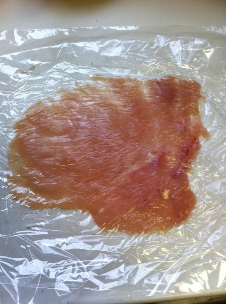 ![]() 鶏胸肉はラップに挟み、麺棒で叩いて薄く延ばし2等分に切る。