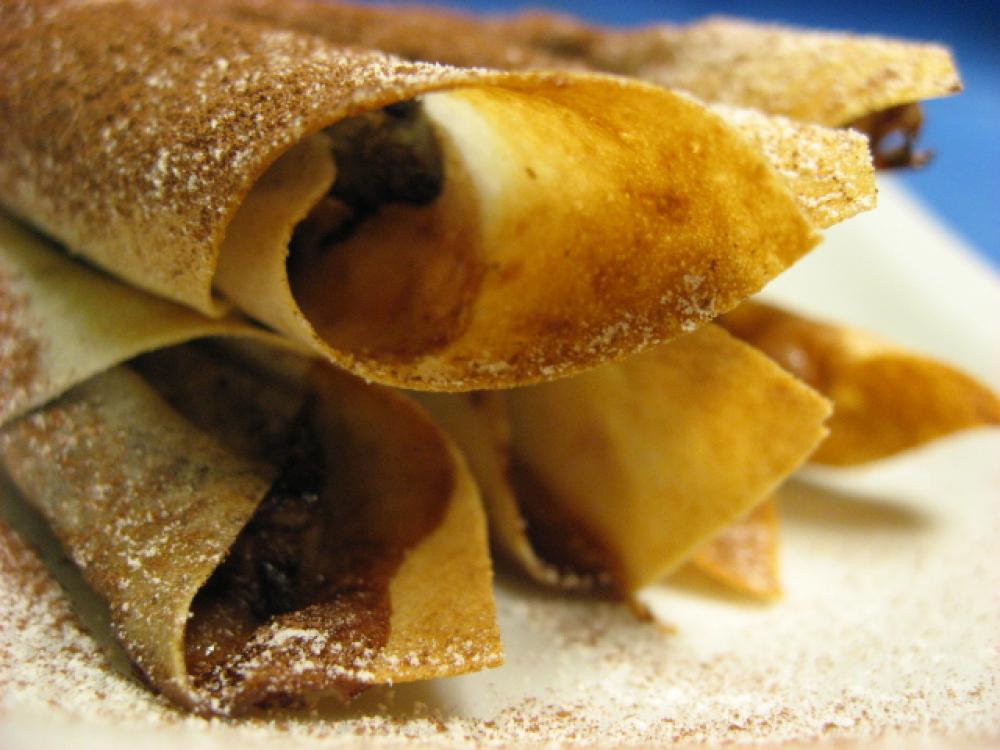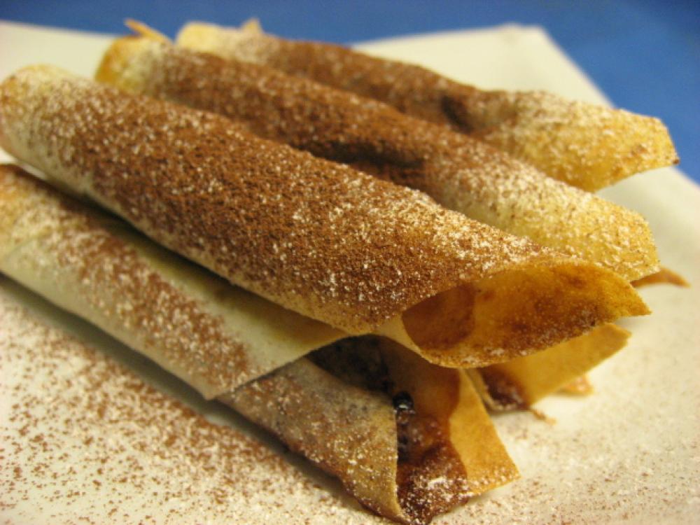 三角の真ん中にココアとシナモンをまぶしたバナナを巻き上げる。