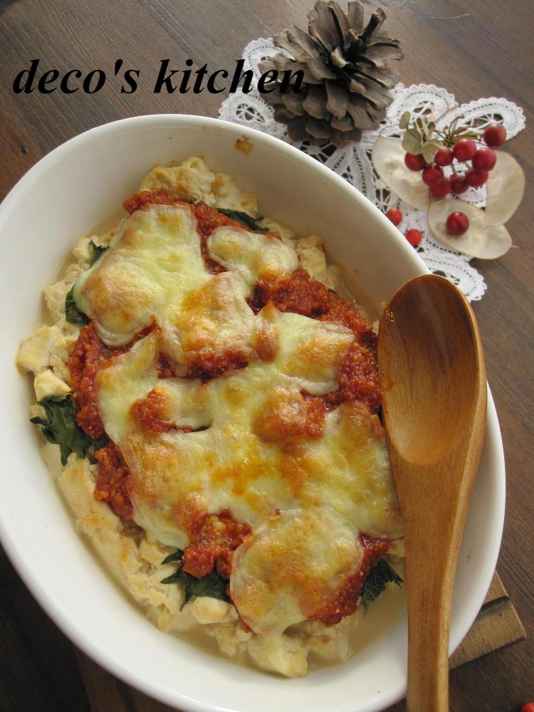 耐熱皿に豆腐を入れてソースをかけ、手でちぎった大葉→チーズをのせ、オーブントースターで5~10分焼く。(焼き色をつける)