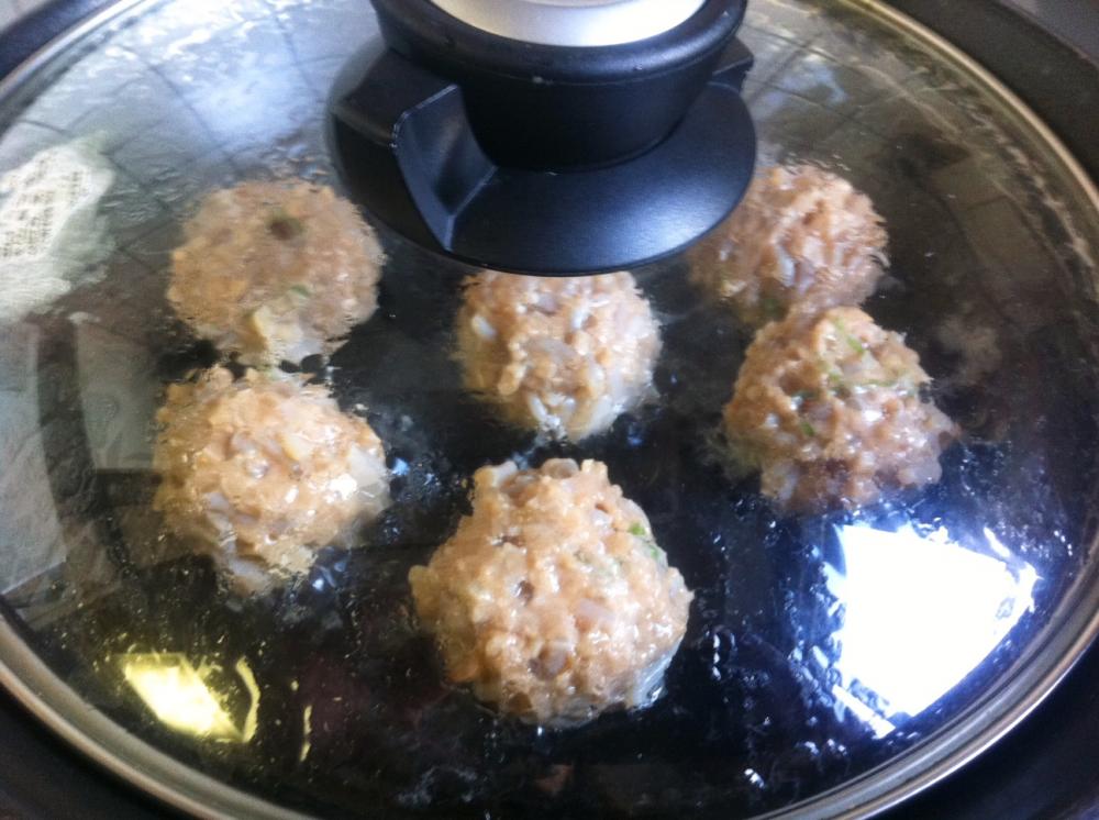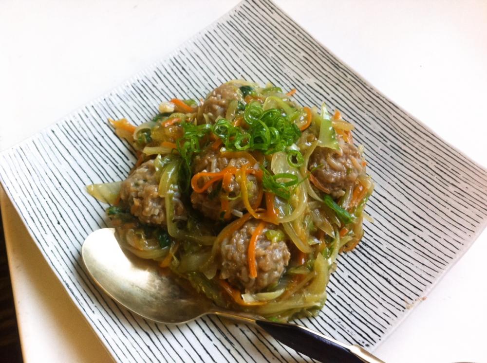 ![]() 手順2のフライパンに蒸し焼きにした肉団子を戻し野菜あんと合わせふつふつ煮立てて完成。器に盛ってネギをトッピングに散らす。