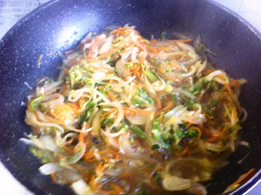 ![]() 手順1のフライパンに材料Bの野菜を入れ炒め、しんなりしたらCの調味料を入れる。最後に水溶き片栗粉でとろみをつける。