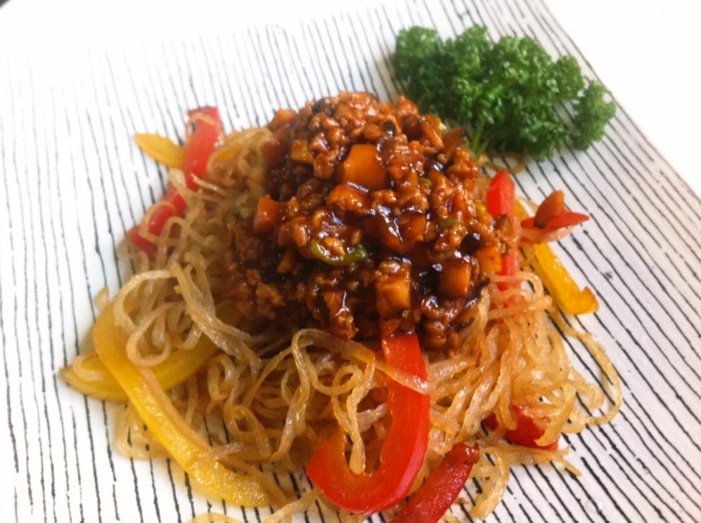 フライパンに油を熱し、赤・黄のパプリカを炒め、白滝としょうゆを加えさっと炒め合わす。お皿に盛り肉味噌をのせて完成。