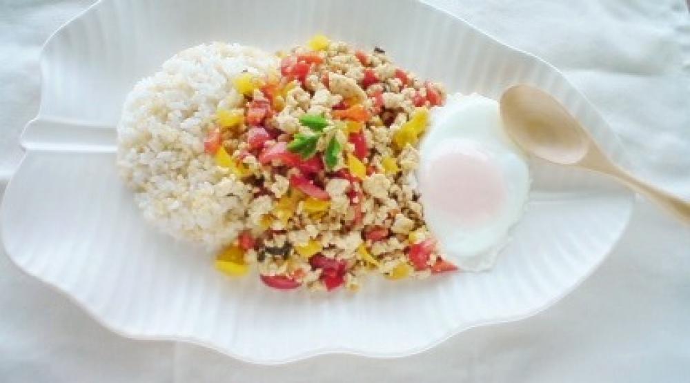 炊いた玄米と2のガパオを器に盛りつけ、空いたフライパンで目玉焼きを作って更に上に乗せる