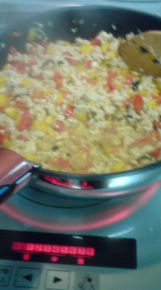 ![]() 1にAを加えて汁がなくなるまで中火で炒め、パプリカとバジルを加えて軽く混ぜる