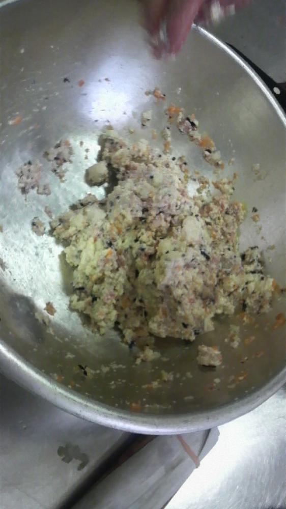 ![]() ①、②とあいびきミンチに塩こしょうとたまご、パン粉を良く混ぜる。