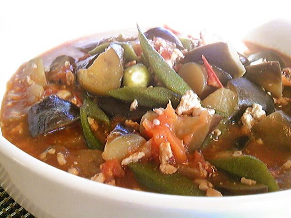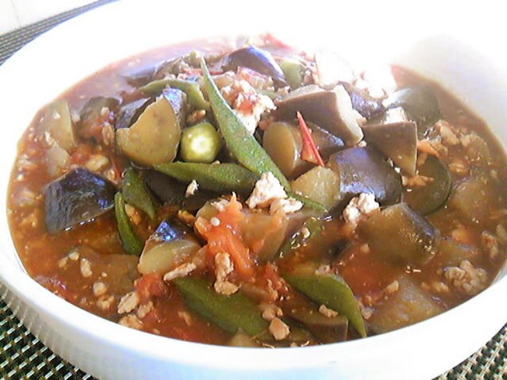 茄子が柔らかくなったらざく切りのトマトと乱切りのオクラを投入、砂糖・塩・みりん・醤油で調味する