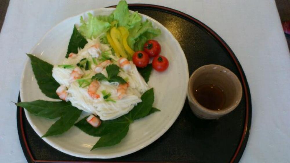 器に、レタス、プチトマト、パプリカを置き、長芋をそうめんのように盛り、海老、三つ葉を散らす。