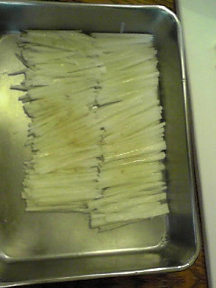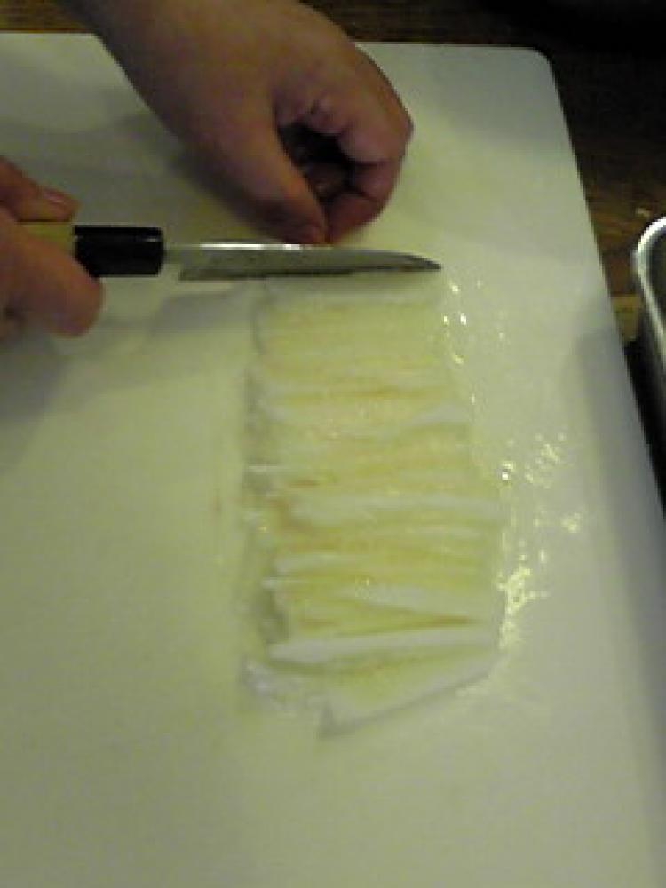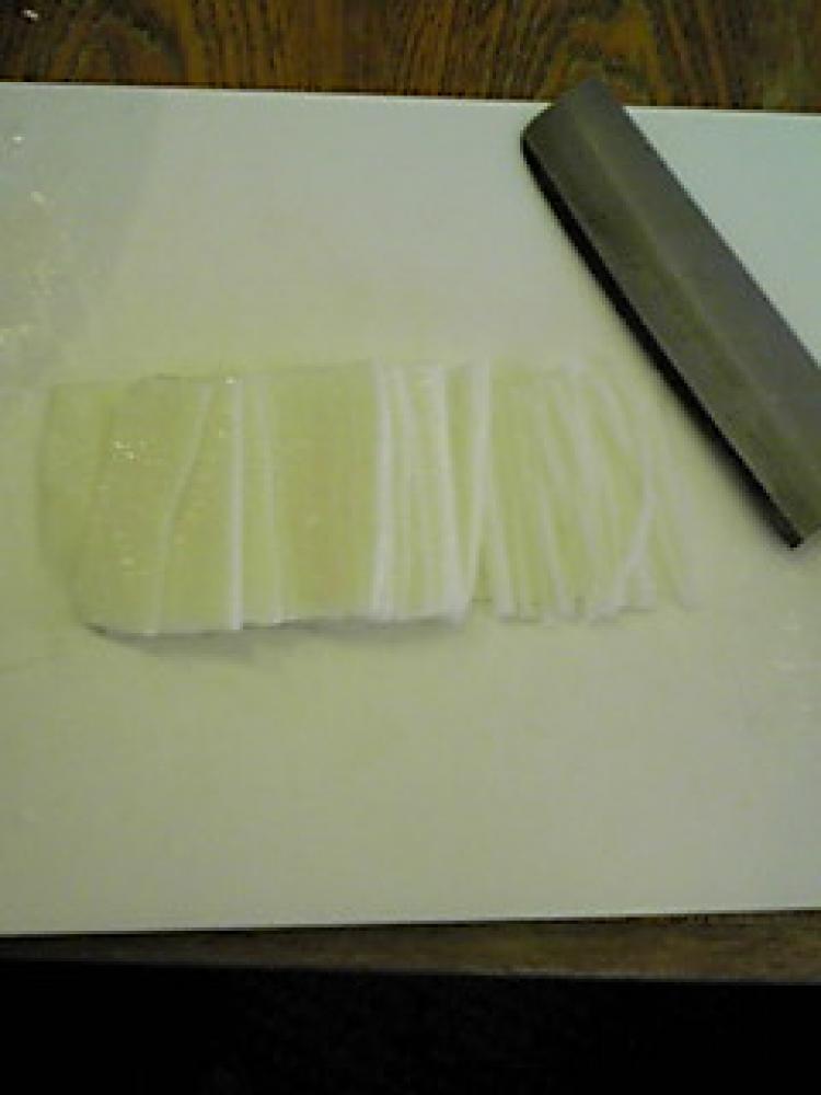 ![]() 端からトントンと叩くようにして、そうめんのように細く切る。