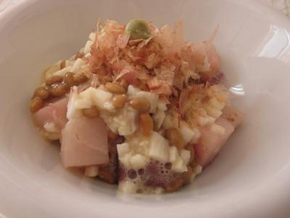①ブリの刺身を2cm角くらいに切り、やまといもは粗みじん切りにし、納豆はたれと合わせ混ぜておく。