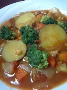 水カップ3とコンソメ、カレー粉を加えて煮立て、アクを除き、トマトの水煮缶を加えて野菜が柔らかくなるまで煮込んでください。