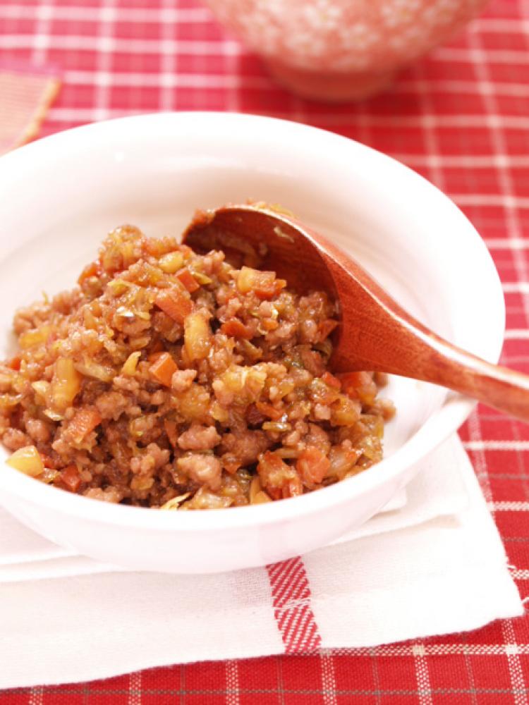 小鍋にサラダ油を熱し、豚挽き肉を炒め、肉の色が変わってきたらキャベツとにんじんを加え火を通し、調味料を加えて汁気がなくな