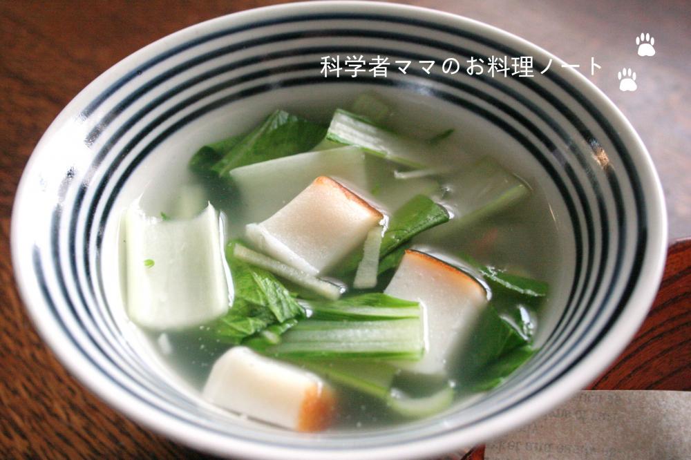 ![]() 鍋にお湯800ccを沸かし、生姜を入れて強火で3分、さらにかまぼこを入れて弱火で3分煮る.
