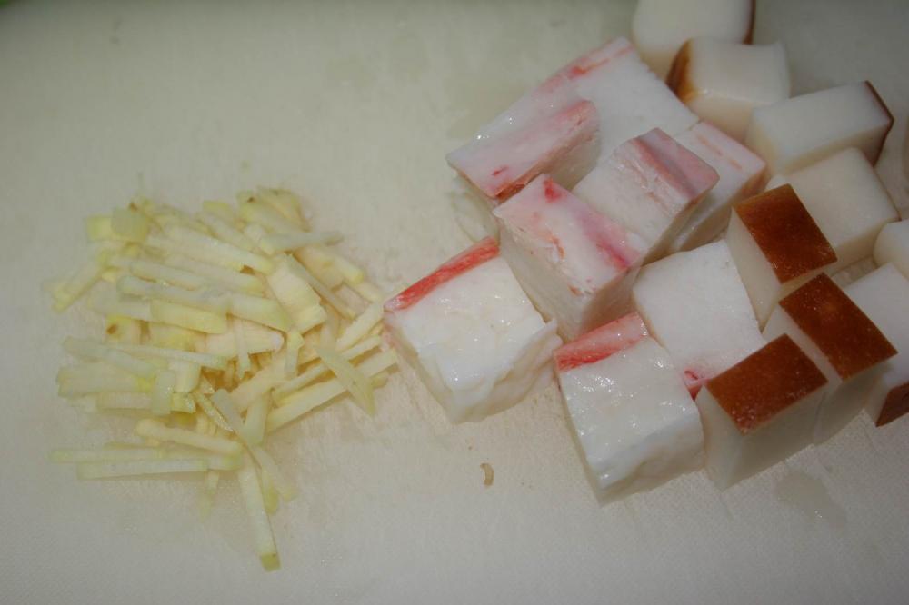 ![]() 生姜は皮をむいて細く切る. かまぼこは一口大に切る.