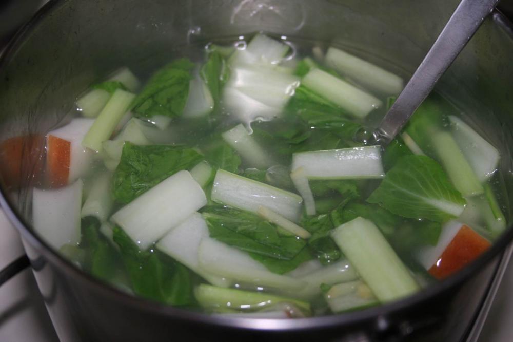 塩小さじ2/3を加え、しろ菜を入れて混ぜたら2分煮る.