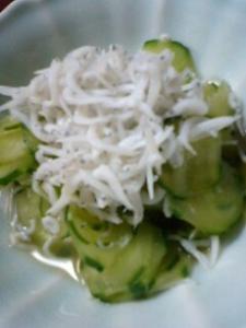 キュウリとシラス干しの2/3を入れ、よく味がなじむように混ぜてください。